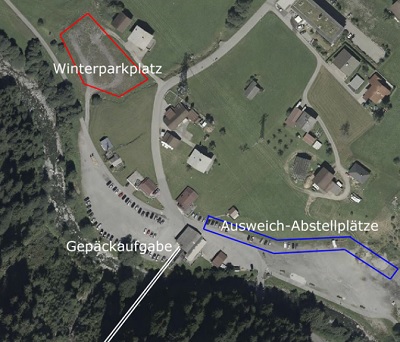 die Möglichkeit den südseitig/taleinwärts der Talstation gelegenen Parkplatz mitzuverwenden, wobei Fahrzeuge nur am linken, hangseitigen Rand abgestellt